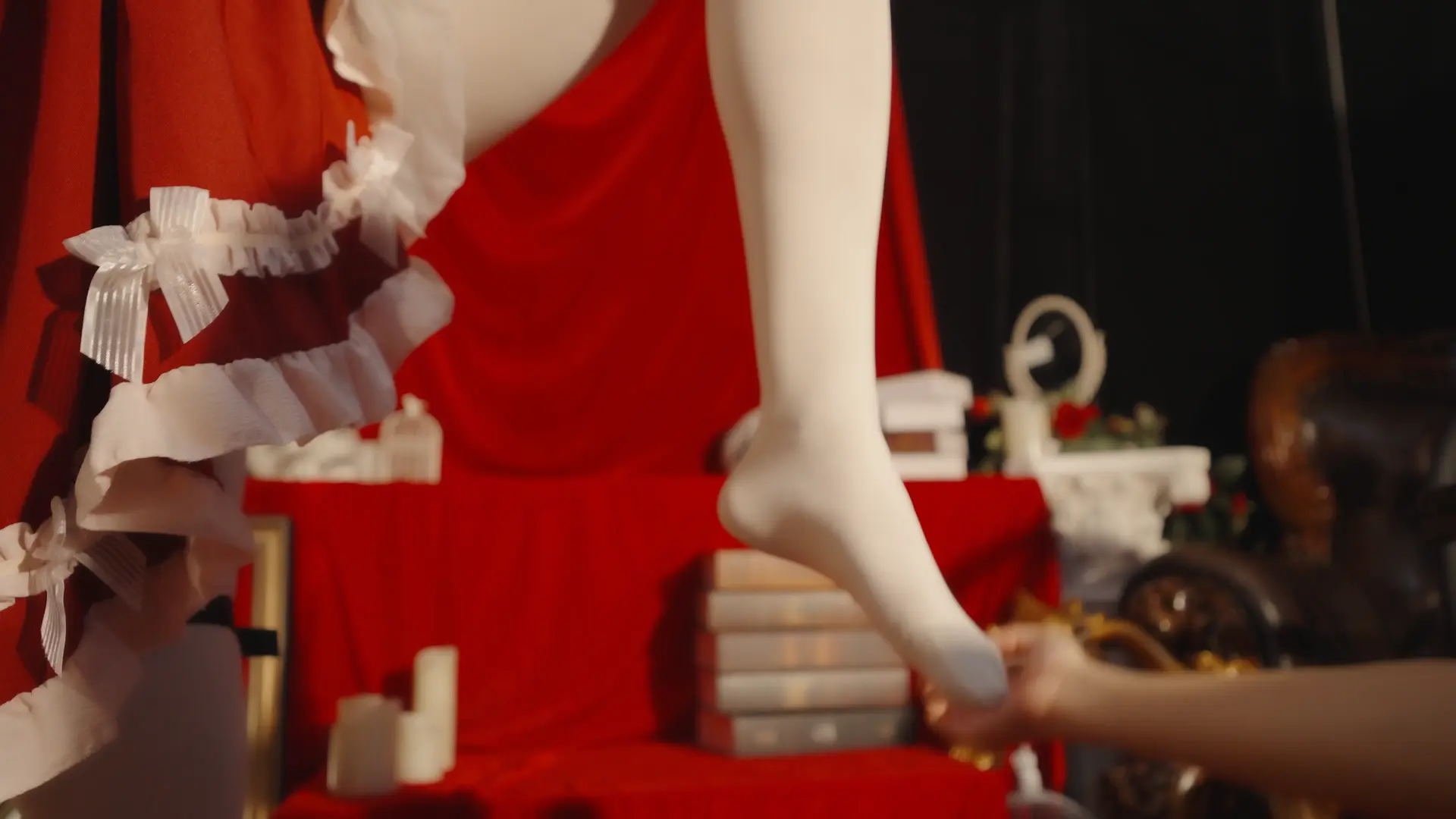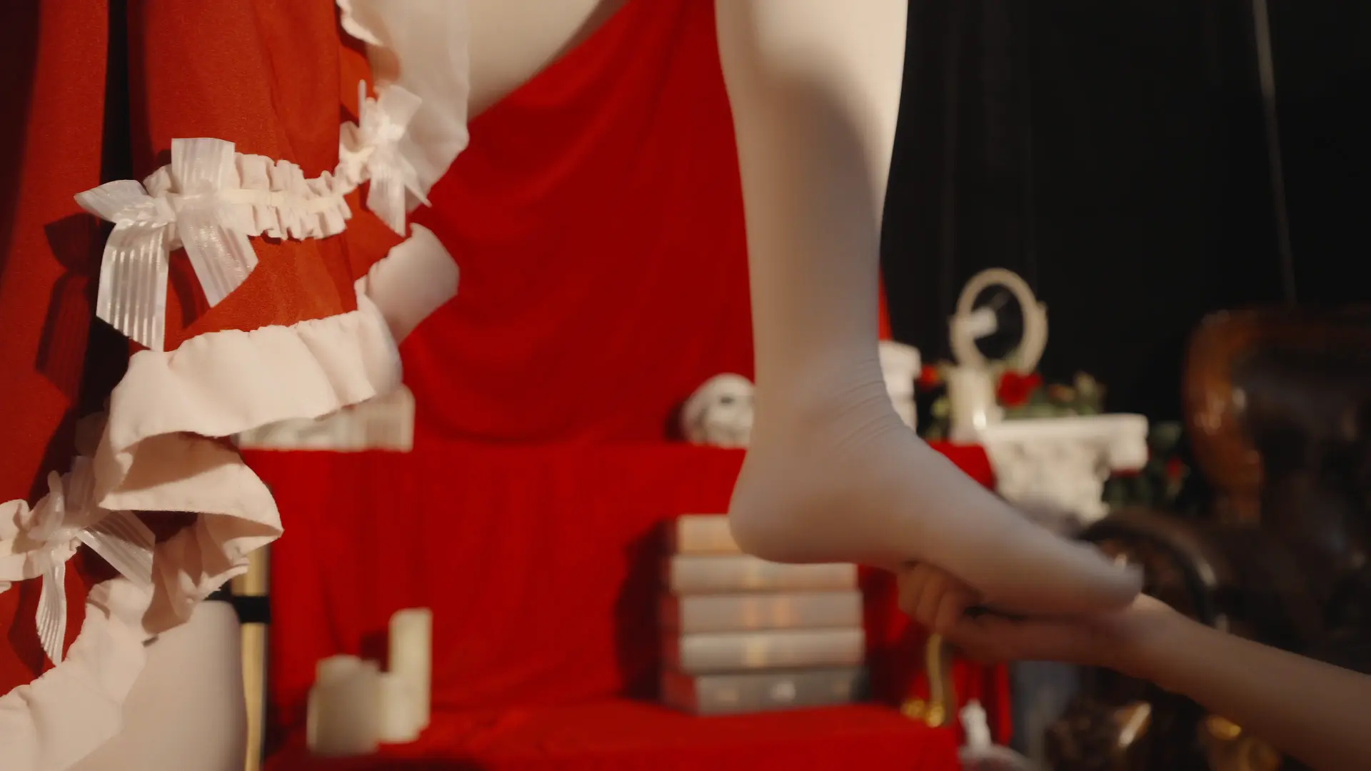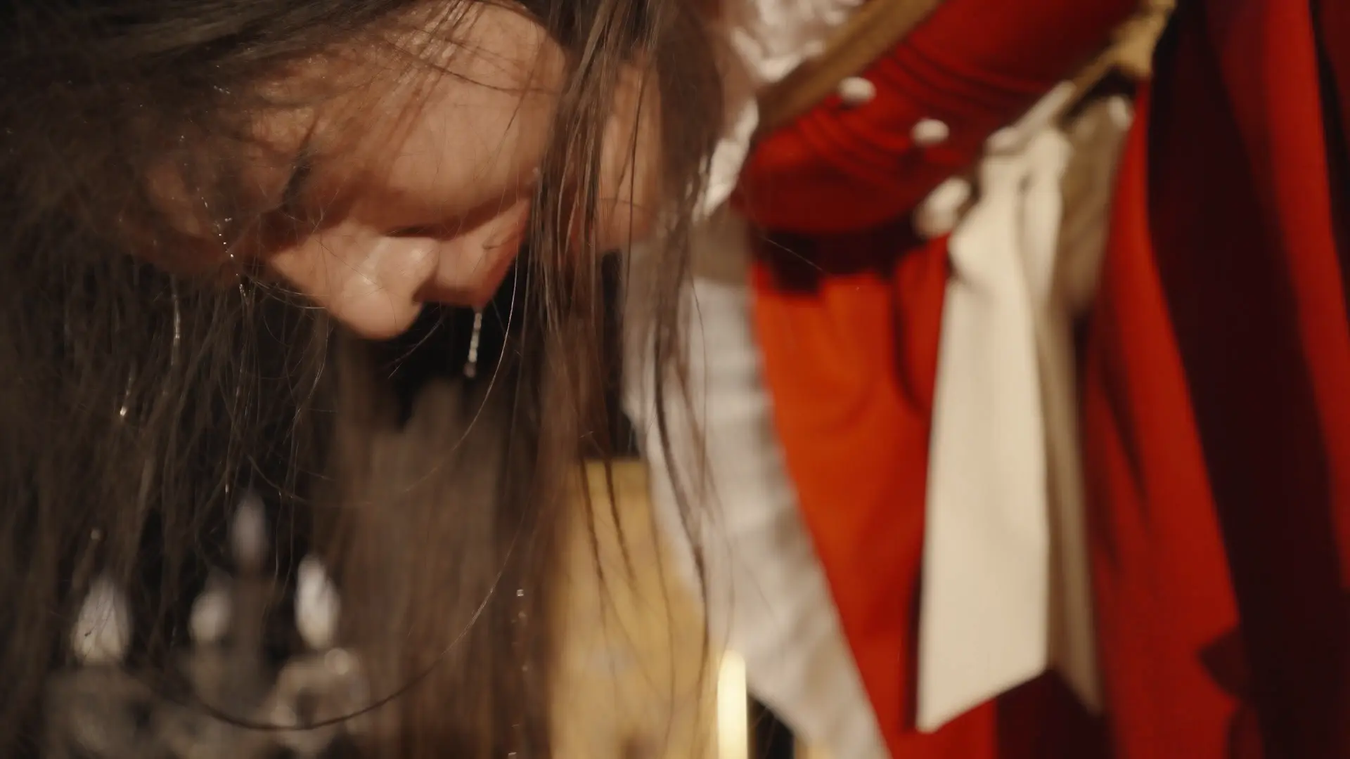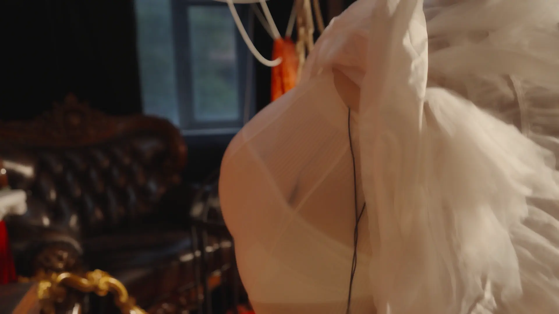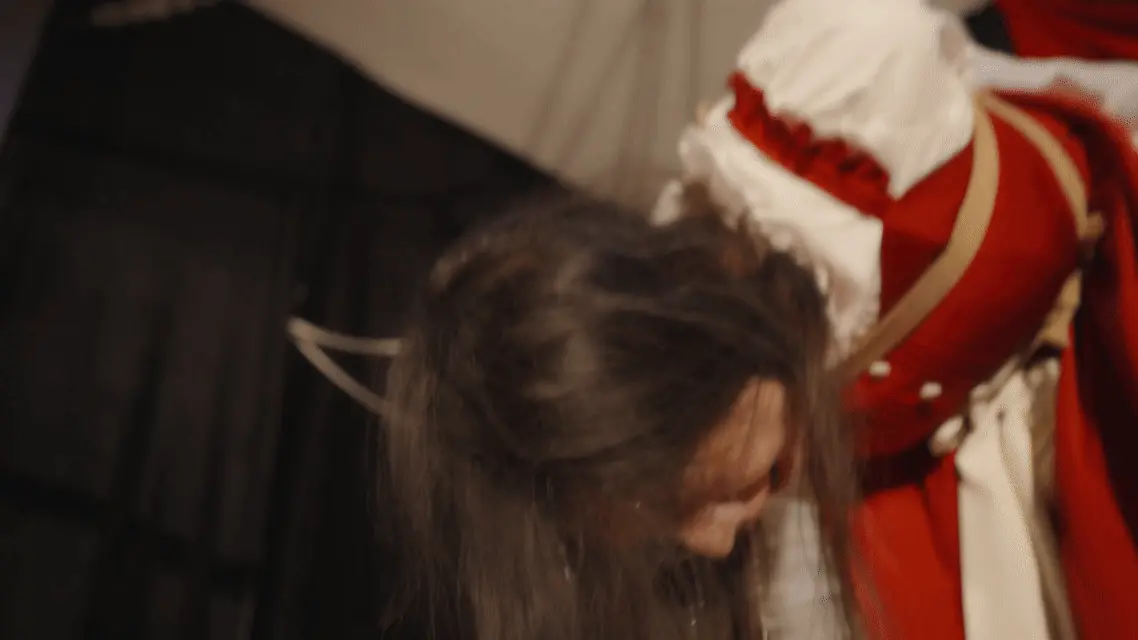 哥特房间里,少女双臂被狠狠地用绳子捆在一起并被起重机吊在屋顶,随着时间的推移知觉渐失。在这中世纪欧洲的阴森穹顶下,响彻着无助的哀嚎和痛苦的呻吟,不知是否是疼痛带来的[X_X]竟让少女步入[X_X],灯光闪烁,帷幕落下,身上的鞭痕和身上的汗水无声控诉着刚刚发生的一切,悲戚漫过腐朽梁柱。