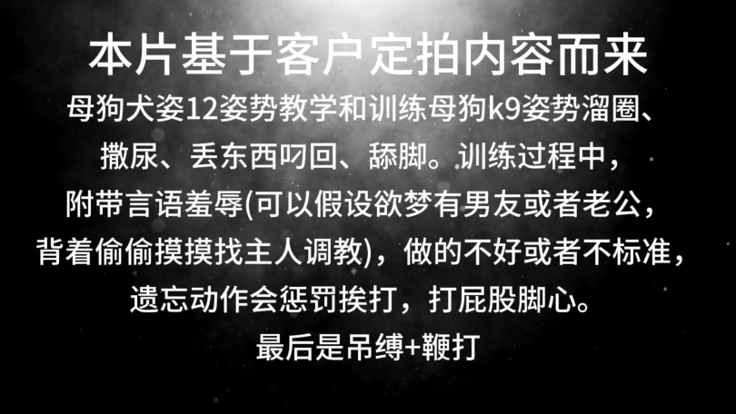 母狗犬姿12姿势教学和训练母狗k9姿势溜圈、撒尿、丢东西叼回、舔脚。训练过程中,附带言语羞辱(可以假设欲梦有男友或者老公,背着偷偷摸摸找主人调教),做的不好或者不标准,遗忘动作会惩罚挨打,打屁股脚心。最后加[X_X]缚+鞭打