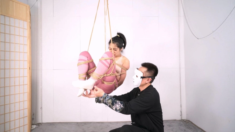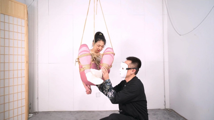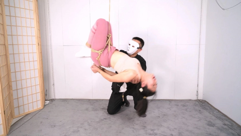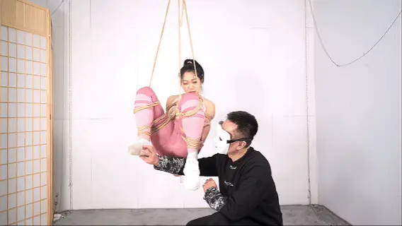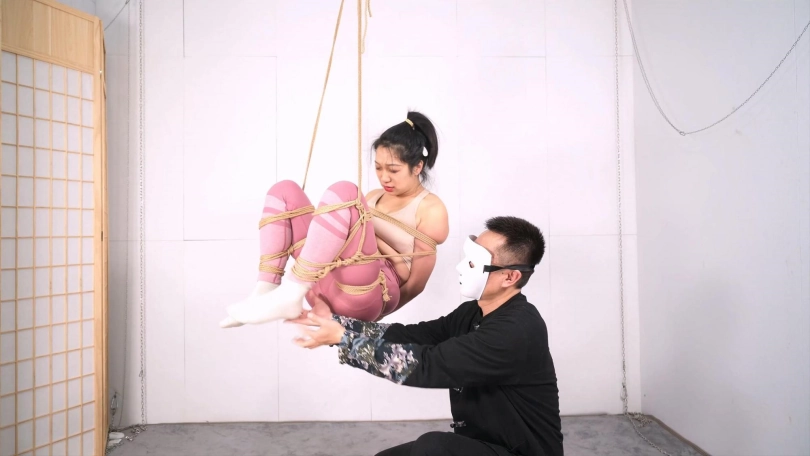 悬吊能不能顺利起吊以及进行下一步的玩乐,关键还是在于地面的准备工作,选择好吊点,用绳子既固定又保护好你的模特或玩伴身体的重要节点,重心的把握也很重要,特别是今天这个腰腹吊,重心调整好了,你可以用四两之力随心摆弄她整个身体,当然,还有一个很重要的事情就是选一个有点承受力的模特,每一次悬吊对于模特都不是一件轻松的事情,所以我特意选了王牌模特沐小雨来尝试这个腰腹吊,,但就是她起吊后,也会身体自然蜷缩,这是人的自然反应,她宁愿蜷起腿倒吊那个姿势也不愿平躺,这就是第三个重要的事情,模特情绪的安抚和疏导,让她“放松”,对你没听错,吊起后她需要放松,并让她确认自己虽然吊着,但是安全的,老的绳模经历过起吊初期的疼痛感后慢慢进入绳意心流状态,类似于长跑者的“跑步高潮—runners high”,不知道是不是我首次提出这个概念,就叫绳意心流状态吧,通俗点说就是她们口中说的,过去那个劲就不感觉那么疼了,有M属性的模特能把意识融入绳子的感觉里达到心流状态,如果她根本不着急让你放她下来,甚至想多玩一会,就是有这个意思了,你提前知道这些就可以用你的方式疏导你的玩伴了吧。本片尝试了起吊后的几个好玩的姿势,高度和位置刚刚好,很有指导意义,最后筋膜枪收尾,一次完美的悬吊体验