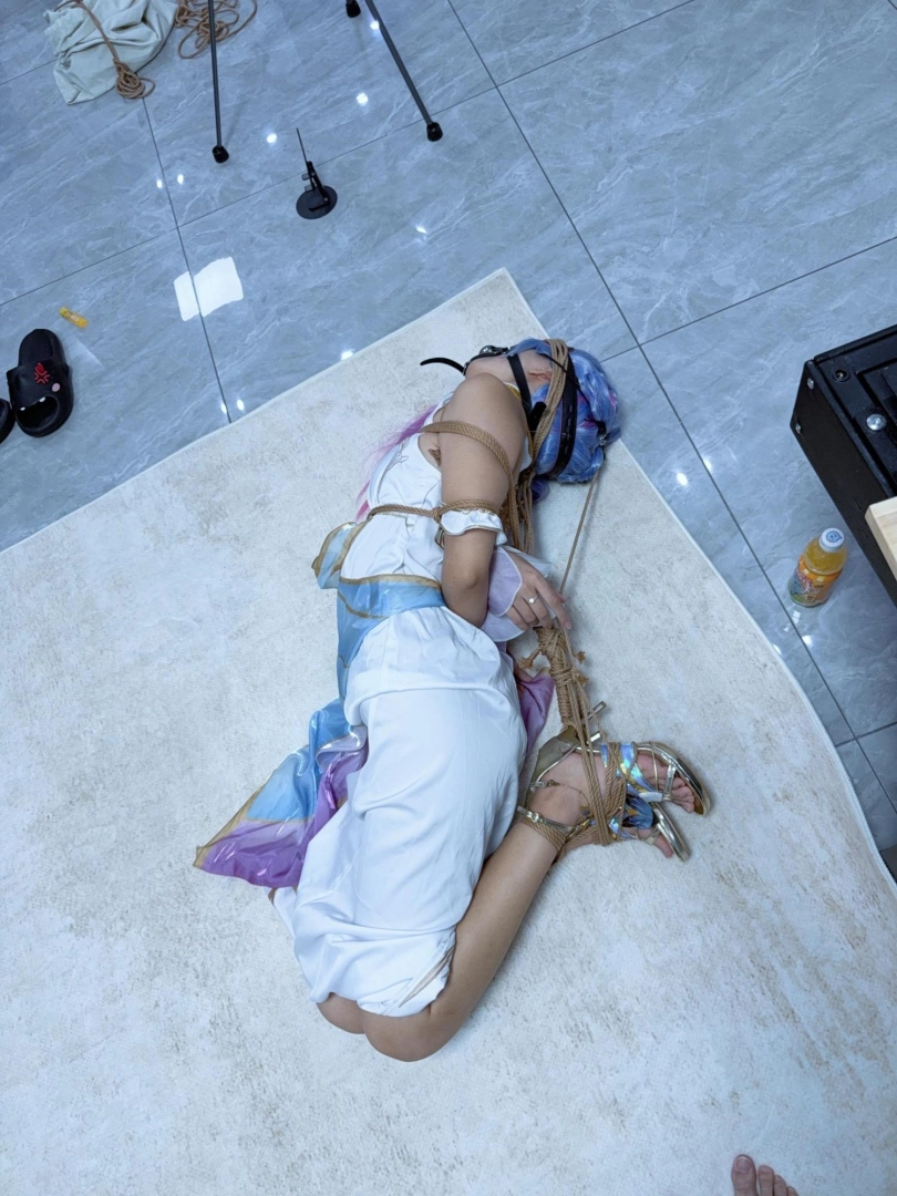 场景2:在场景1崩溃痛哭后没有休息,短暂解开后脱下高跟鞋,改成绑脚趾的极限驷马,脚趾脚掌脚腕都分别固定后下压连接在腰绳上~