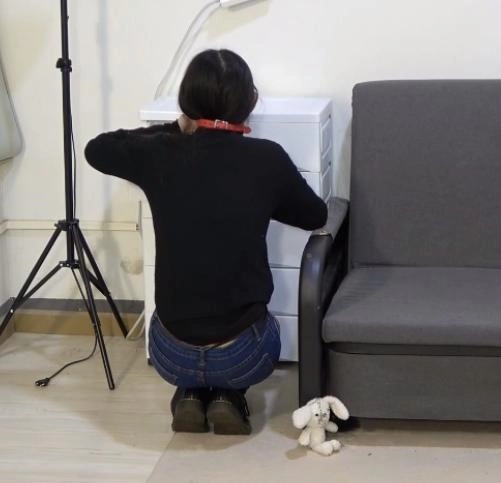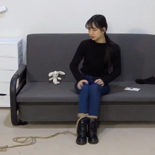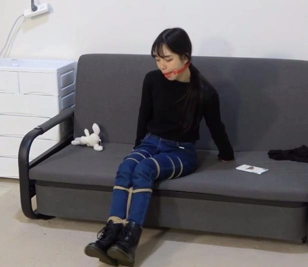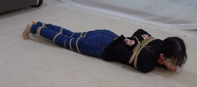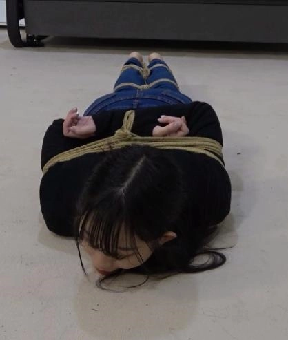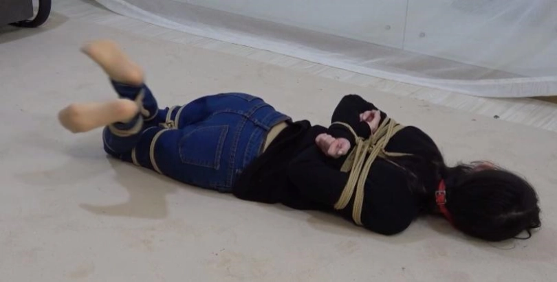她努力的拿到了剪刀,好不容易挣脱了一点,结果又从自己的双腿开始,又被一卷黑色的胶带慢慢的捆了上来,最后又被黑色胶带把自己全身捆了个遍。