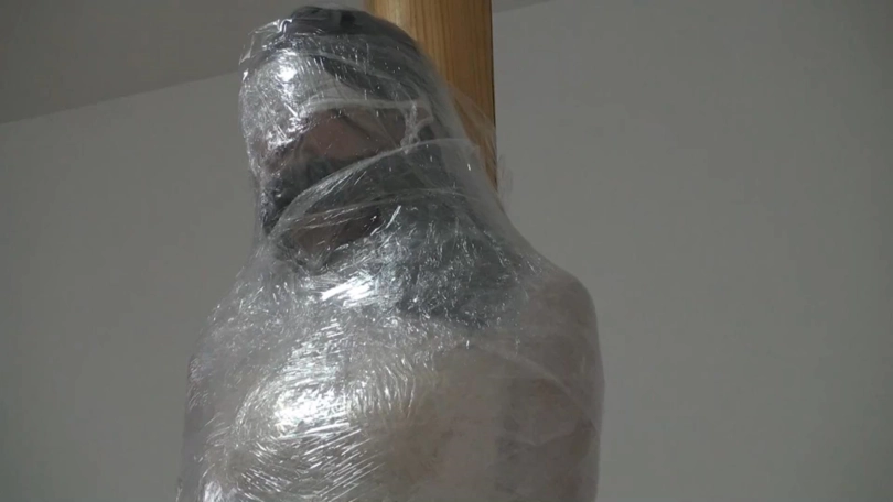 林丹丹被保鲜膜全包着,连身子都无法转动。