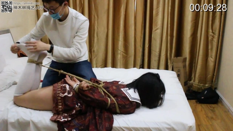 妹子还是第一次体验捆绑,害羞的很呢。不过绑成驷马就只能乖乖的趴在床上啦√