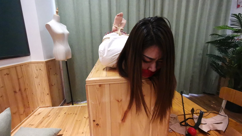 老师双腿交叉捆绑在讲台上,并用连裤袜勒住嘴,这个姿势让老师难受的不断挣扎;接下来老师又被学生驷马绑在讲桌上,并不断的虐足玩弄。。。
