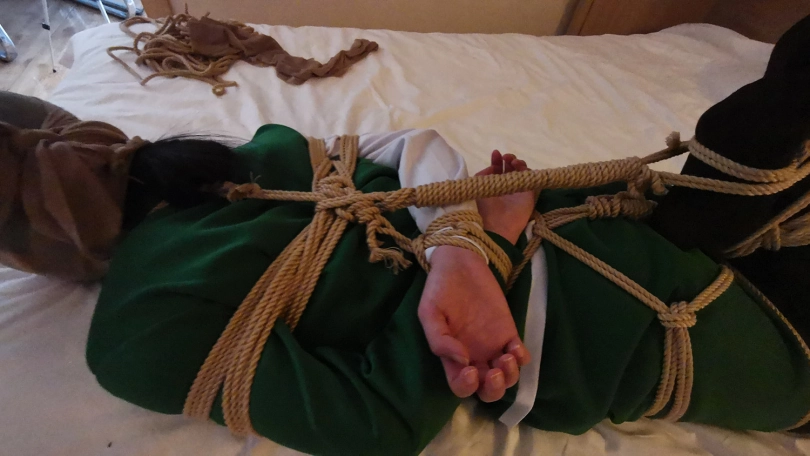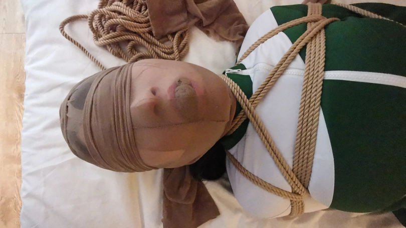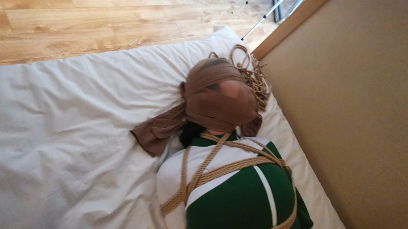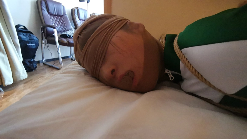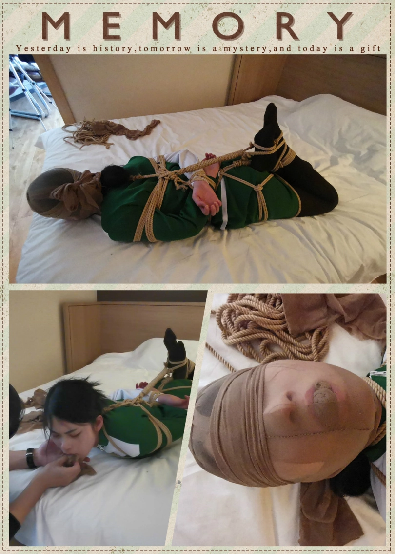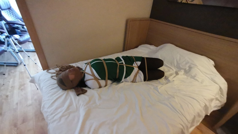 脱掉靴子趴在床上紧紧的捆绑成驷马,嘴里塞进丝袜,并用丝袜套住头蒙住眼睛。骗她有事出去下,小冷以为我真的出去了,房间就剩下被绑成粽子的自己,开始慌了,开始挣扎,并叨咕着什么(被堵着嘴,也不知道这丫头说的啥)。